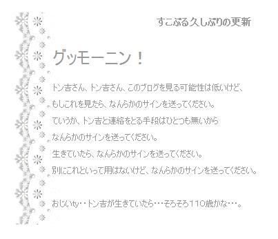 「そー言えば最近、㌧吉を見てないわねぇ。。」
